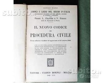 Manuale Hoepli "Nuovo Codice di Procedura Civile. Edizione riveduta e aggiornata al 15 ottobre 1942". Da rilegare copertina mancante il laterale a parte questo il libro è in buono stato.