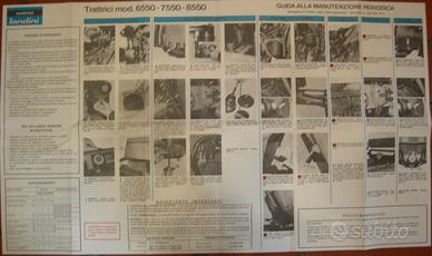 Manuale di uso e manutenzione originale in lingua italiana per trattore Landini 6550 7550 8550 a 2 ed a 4 ruote motrici versione piattaforma e cabina completo della tabella illustrata della guida alla manutenzione periodica del formato di cm 70 x 40 (dati per l’identificazione, servizio assistenza e ricambi, caratteristiche, applicazioni ausiliarie, combustibile, rifornimenti, strumenti di controllo e comandi, norme di sicurezza, norme d’uso, manutenzione). 80 pagine. Formato mm 150 x 210. Vendo a 90 euro. Tel. 389/4248546 o 085/8207262