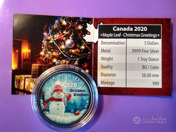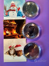 STUPENDA SERIE COLORATA DI 3 MAPLE LEAF DA 1 ONCIA DI PURO E FINE ARGENTO 999,9 EMESSA PER IL NATALE 2020.
