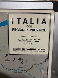 Mappa d'Italia Vintage Magnetica – Edizioni Di Lauro Milano (Buffetti) Vendo bellissima e rara mappa geografica dell'Italia politica (Regioni e Province), prodotta dalle storiche Edizioni Di Lauro Milano per Buffetti (Mod. 0937). La mappa non è solo un pezzo cartografico di precisione, ma un vero e proprio complemento d’arredo dallo stile vintage industriale. La particolarità di questo modello è il supporto posteriore in metallo zincato, che la rende magnetica: perfetta per attaccare calamite, segnaposti per viaggi o appunti. Caratteristiche principali:Dimensioni: 121,5 cm (altezza) x 102 cm (larghezza).Scala: 1 : 1.000.000 ($1 \text{ cm} = 10 \text{ km}$).Materiali: Superficie frontale plastificata/lavabile, cornice perimetrale in alluminio robusto e retro in metallo zincato.Stato di conservazione: Ottime condizioni generali, colori vividi e struttura integra. Ideale per uffici, scuole, camerette o locali in stile retro.Dettagli: Edizione originale con indicazione di Via Govone 56, Milano. Un pezzo di grande impatto visivo e funzionale, pronto per essere appeso (sono presenti i fori di fissaggio agli angoli superiori).