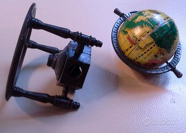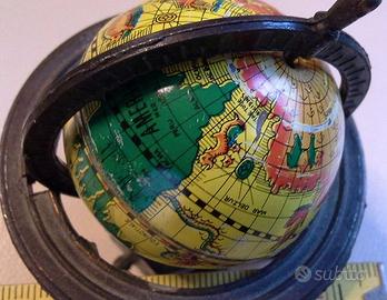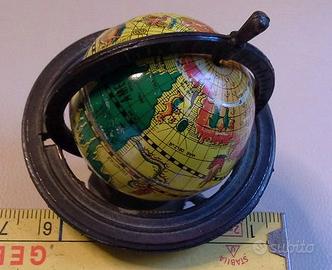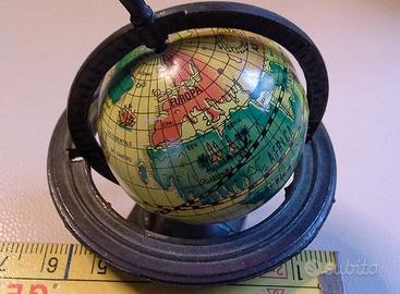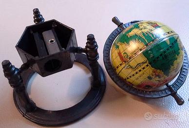 Piccolo oggetto da collezione anni '80 alto circa 9 cm e largo 6,5 cm. Il tutto risulta formato da due parti distinte che si possono dividere: la struttura che lo sorregge e il mappamondo vero e proprio che si appoggia e ferma nelle due fessure. La struttura in bronzo a tre piedi sorregge il mappamondo di latta artisticamente, finemente e minuziosamente decorato con illustrazioni e scritte come da foto. La base contiene in basso un appuntalapis funzionante anche se non è mai stato usato.
