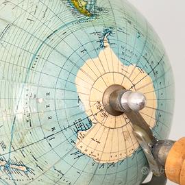 Raro e affascinante globo terrestre “Mang’s Neuer Erd-Globus” di 17 cm di diametro (54 cm di circonferenza), seconda edizione (IIte Auflage), pubblicato a Stoccarda da Ad. Mang’s Geographisch-Astronomischer Verlag e realizzato sotto la supervisione scientifica del Prof. Dr. Stricker, come chiaramente indicato nel cartiglio centrale. Si tratta del formato da 17 cm, versione più rara rispetto ai modelli standard, particolarmente ricercata per le dimensioni contenute e per la qualità esecutiva. Il cartiglio tipografico, elegante e ben strutturato, conferisce forte personalità all’insieme e testimonia l’elevato livello editoriale della produzione tedesca dell’epoca. Il globo si presenta in buono stato di conservazione generale, con patina coerente con l’età, alcuni segni e leggere macchie sulla superficie cartografica che non ne compromettono la leggibilità ma ne attestano l’autenticità e la storia. Il supporto in metallo ha subito un intervento di restauro conservativo che ne ha consolidato la struttura senza alterarne l’estetica né la piena funzionalità, consentendo una rotazione fluida e corretta. La base tornita in quercia di rovere integra una meridiana graduata di grande fascino e una bussola funzionante incassata nel piano, elementi che arricchiscono l’insieme sotto il profilo scientifico e decorativo, rendendo questo esemplare non solo uno strumento geografico ma anche un raffinato oggetto da collezione, ideale per appassionati di cartografia storica e strumenti scientifici d’epoca.