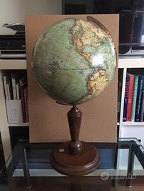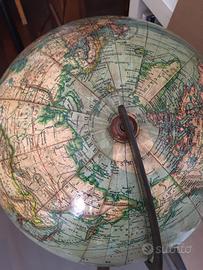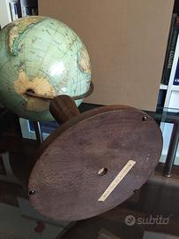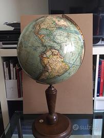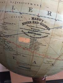 Raro mappamondo politico tedesco editore Mang’s Stoccarda anni’20 circa. Grande mappamondo in cartapesta del diam. di 33 cm, alto 64 cm, con base in legno tornita, bussola in vetro e asse dei meridiani in ottone. Cartografia molto dettagliata con le colonie dell’epoca, presente ancora il Siam e Costantinopoli, marchio dell’editore, legenda, linee di navigazione, rotte aeree, rotte Graf Zeppelin. Buone condizioni con normali segni del tempo e di utilizzo (vedi foto) nessuna ammaccatura!