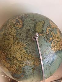 Raro mappamondo politici/fisico Déco Columbus, Germania anni ‘30. Cartografia molto dettagliata con le colonie dell’epoca, linee di navigazione, rotte aeree e rotte Zeppelin, Somalia italiana, presente ancora il Siam (Thailandia 1939) e Costantinopoli. Base in faggio e alluminio con bussola in vetro, asse dei meridiani in alluminio, condizioni eccellenti, nessuna mancanza! Altezza 50 cm- diam. 33 cm