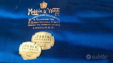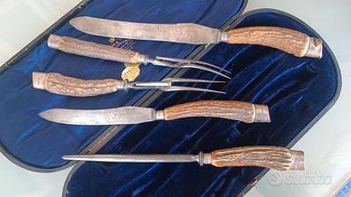 Elegante servizio da arrosto realizzato in Inghilterra alla fine dell’800, posto all'interno della sua confezione originale, cofanetto rivestito esternamente in pelle con lieve abrasione e velluto blu all’interno: composto da 5 posate con manici in corno rifiniti in argento 925, 2 coltelli, un affila coltelli e 2 forchettoni Le lame dei coltelli sono punzonate Mappin &Webb. Usato ma in ottimo stato di conservazione.