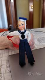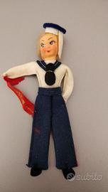 Altezza cm. 12 da collezione. Rivestito in lenci: abito da marinaio. Pantaloni blu; camicia bianca con colletto a sciarpa blu; cappello blu e bianco . I capelli sono biondi di materiale incerto (forse lana). Il volto è in panno con sopracciglia, occhi e labbra dipinte. Il tutto è in ottime condizioni. E’ invece rotto il nastrino rosso che il marinaretto ha in mano e su cui si legge chiaramente solo la parola ITALIA.