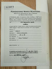opera originale di Mario Schifano, realizzata tra il 1990 e il 1997 con tecnica mista su fotografia. L’opera, di forte impatto visivo e tipica della produzione tarda dell’artista, presenta interventi pittorici materici su base fotografica, con composizione minimale ed elegante. ✔ Autenticità garantita Archiviata presso la Fondazione Mario Schifano (Roma), con certificato originale incluso. ✔ Dettagli tecnici: •Tecnica: mista su fotografia •Dimensioni opera: cm 10 × 15 •Firma: presente sul retro (“Schifano”) •Periodo: 1990–1997 •Cornice: inclusa, con ampio passepartout (come da foto) cm 40 x cm35 ✔ Condizioni: Ottime condizioni generali Opera ideale per collezionisti e appassionati di arte contemporanea italiana.