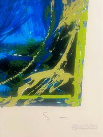 Raffinata serigrafia materica a smalto su carta di Mario Schifano, datata 1996. Un’opera magistrale realizzata con ben 30 passaggi di colore, che restituisce la tipica gestualità pittorica e la ricchezza materica del maestro della Pop Art italiana.