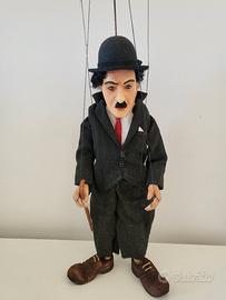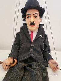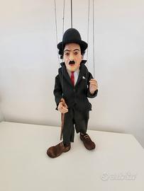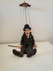 In legno e stoffa, completa di fili originali e bilanciere in legno. Figura curata nei dettagli con abito classico nero, bombetta e bastone, perfetta per chi cerca oggetti retrò, teatrali o da esposizione. Oggetto ideale per appassionati di marionette, teatro dei burattini, collezionisti di oggetti vintage o arredamento particolare. Ottima anche come idea regalo originale o per allestimenti scenografici. La marionetta è funzionante, i fili sono integri e permette il movimento di braccia e gambe. Condizioni buone con normali segni del tempo che ne aumentano il fascino vintage. Tag: arionetta vintage, burattino, pupazzo teatrale, puppet, Charlie Chaplin, Charlot, teatro, collezionismo, vintage decor, oggetto d’epoca, marionetta legno, decorazione casa, arredamento retrò, spettacolo, teatro dei burattini, antiquariato, regalo originale, puppets, marionette artigianali.