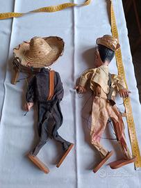 Due marionette vintage alte cm 42, provenienti dal Messico, la testa e le mani di ceramica, i piedi di legno, in buone condizioni. Vendita in coppia.
