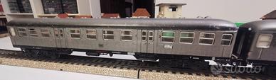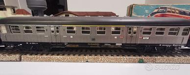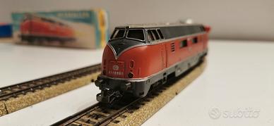 Locomotiva analogica scala H0 v200 DB completamente in metallo. Funziona perfettamente avanti e indietro, ottima trazione l unico difetto é che non funzionano le luci. 3 vagoni 4043 silberling tutti in metallo come da foto. Disponibile video funzionamento.