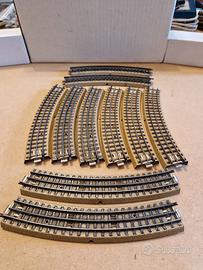 Il lotto comprende 10 binari curva media modello anni 50 con terza rotaia, in ottime condizioni come da foto senza scatola originale.