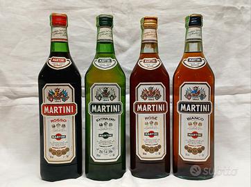 Vendo confezione di 4 bottiglie di vermouth MARTINI, tutte diverse tra loro, nella tipologia di MARTINI ROSSO - MARTINI BIANCO - MARTINI DRY - MARTINI ROSÉ. Bottiglie in LIMITED EDITION da 50 cl. Prodotte nel 2005, documentato nella stampigliatura sul retro. Pubblicitario per collezionismo o arredamento bar. Ottima idea regalo. CONSEGNA A MANO.