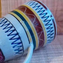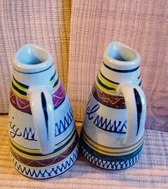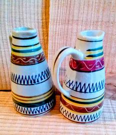 W.Germany. Marzi & Remy keramik stein. Vintage anni '50. Ampolline olio e aceto in gres. Tecnica a incisione e sgraffio non facile da trovare. Decorazione molto accurata a bande vivaci e multicolori in parte realizzata con pittura a mano in parte con segni incisi o impressi. In ottime condizioni. Mancano i tappi originali. cm 9 cm 11 fondo cm 5.