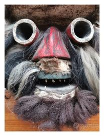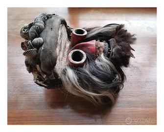 Maschera africana antica originaria della costa d'Avorio We (Guere ') materiale legno intagliato con pigmenti policromi Rossi e bianchi. Fibre naturali con peli di animali conchiglie e uno scheletro di piccolo l'uccello rapace. Sulla bocca denti umani Spesso descritta come maschera da guerra o per occasioni cerimoniali. Pezzo unico del genere (col teschio). Misure 35 x 30 x 20, buone condizioni per gli anni che ha.