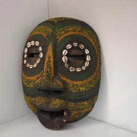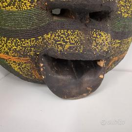 Maschera africana Ashanti Baluba Moon Mask legno perline conchiglie Vintage. Maschera africana in stile Ashanti/Baluba, intagliata in legno scuro e decorata con perline colorate e conchiglie. Forma circolare con occhi intarsiati e dettagli ornamentali. Tradizionalmente associata alla simbologia della luna nelle culture dell’Africa occidentale. Materiali: legno, perline (jigda beads), conchiglie. Dimensioni: circa 34 x 27 cm. Condizioni molto buone, come da foto. Oggetto decorativo etnico vintage di grande impatto visivo. Spedizione con imballaggio accurato o possibilità di ritiro a mano a Varese o a Milano.