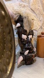 Il pezzo raffigura una figura antropomorfa stilizzata con corna e zanne in pietra, capigliatura in fibra/crine e tratti marcati, richiamando simbolismi ancestrali legati al mondo degli spiriti, della protezione e della forza.
