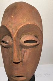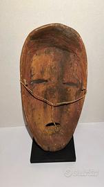 Splendida maschera etnica appartenente alla tradizione del popolo Lega (RD Congo), realizzata in legno intagliato a mano. Pezzo decorativo dal forte impatto visivo, caratterizzato da linee essenziali, volto stilizzato e patina naturale che ne esalta il fascino autentico.