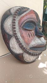 Maschera scolpita a mano in unico blocco, tipologia Chokwe/Pwo (area Congo/Angola): cicatrici lineari sulle guance, motivo romboidale sul centro fronte, occhi a fessura. Cornice circolare decorata; volto con kaolino/bianco e patina bruno-rossa. Retro scavato con segni d’attrezzo, foro/cordino per appenderla. Oggetto vintage (prob. anni ’70–’90) destinato all’arredo/collezione; non testata come reperto rituale.