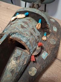 Splendida maschera etnica d'artigianato africano, caratterizzata da una ricca lavorazione multimaterica. Un pezzo d'arredo unico per collezionisti o per chi desidera un oggetto dal forte carattere esotico.