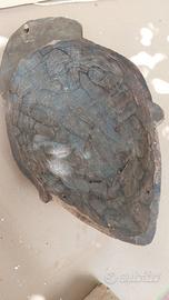 Scavata in un unico blocco con bei segni d’ascia sul retro e fori laterali per legature/raffia. Patina scura antica; fronte con caolino consumato in alcuni punti.