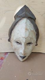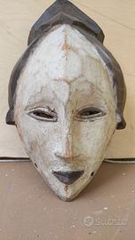 Maschera africana intagliata a mano in legno con volto caolinato bianco, occhi a fessura, naso lungo e piccola bocca triangolare; acconciatura a cresta. Modello riconducibile alla tradizione Punu/Fang (Gabon – Rep. Congo).