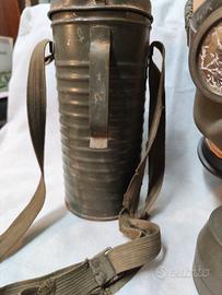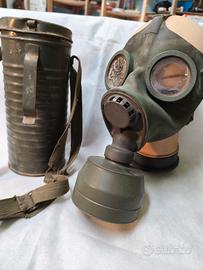 Maschera antigas completa di seconda guerra mondiale, completa di contenitore originale. Prodotta i Svizzera per esercito Tedesco. Completo di custodia, filtro e fibie. In buone condizioni con segni del tempo. Le foto sono parte integranti della descrizione.