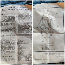 Comprende filtri all'interno delle guance, ricambi delle lenti e istruzioni che venivano date ai militari per il montaggio (in polacco) + maschera dell'esercito Sovietico