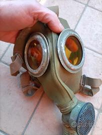 ATTENZIONE: la maschera ha una piccola rottura nel facciale, il filtro espirazione ammaccato. La sacca presenta un piccolo foro frontale. Tubo, cinghie, filtro in ottime condizioni. Ulteriori foto senza impegno. Altra militaria cliccando sul numero di annunci online: wehrmacht, bandiera, maschera gas, regio esercito, militare, elmetto, elmo....