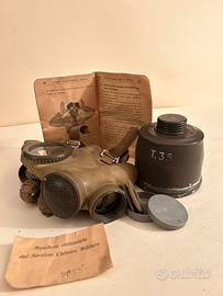 Maschera antigas Pirelli T35 in dotazione nella seconda guerra mondiale, mai utilizzata,completa di custodia, libretto uso e manutenzione e certificato di collaudo del servizio chimico militare. Facciale il gomma verde scuro con incorporati occhiali di protezione e munita nella parte posteriore delle apposite cinghie per il fissaggio al volto. Nella parte anteriore è avvitato il filtro costituito da un contenitore in lamina verniciata a forma troncoconica contenente i preparati che neutralizzavano i gas nocivi.