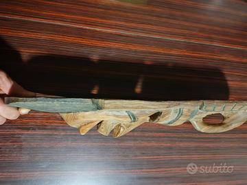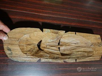 Questo oggetto è una maschera tradizionale africana in legno intagliato, comunemente utilizzata in riti religiosi, danze e cerimonie nelle culture dell'Africa subsahariana. Materiale:Legno scolpito a mano. Uso:Oggetto decorativo o da collezione, spesso raffigurante spiriti, antenati o figure mitologiche. Stile:Caratterizzato da forme geometriche e dettagli stilizzati, tipici dell'artigianato locale.