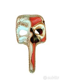 Affascinante pezzo di storia e di arte: un'antica maschera veneziana, meticolosamente realizzata a mano in cartapesta. Questo squisito copricapo per il costume di carnevale di Arlecchino, noto anche come maschera del Dottore della Peste, è uno splendido esempio di artigianato tradizionale veneziano. Realizzata a mano con un'attenta cura dei dettagli, questa maschera presenta un caratteristico motivo di quadrati rossi, bianchi e neri e note musicali color oro, che evoca lo spirito giocoso ed enigmatico del personaggio di Arlecchino della Commedia dell'Arte. L'intricata verniciatura e gli accenti a nastro ne aumentano il fascino, rendendola una vera meraviglia del design. Questa maschera in cartapesta, con il suo timbro originale all'interno, non è solo una reliquia dell'iconico carnevale veneziano, ma anche un tesoro versatile che può fungere da accattivante pezzo di arredamento da parete e da tavolo.