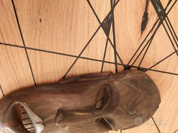 Maschera tribale africana in legno nero Tribale Africana Kenya. (Vintage). La maschera è lunga 25 cm circa. Questa maschera rappresenta il sorriso, è intagliata e dipinta a mano. Da appendere al muro. Un pezzo unico dal fascino misterioso.