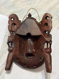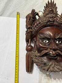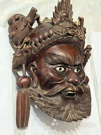Splendida maschera decorativa in legno massiccio di alta qualità, finemente intagliata a mano, riconducibile alla tradizione iconografica dell'Estremo Oriente (Cina/ Giappone).
