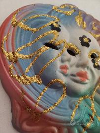 Bellissima maschera ornamentale da parete in gesso dipinta a mano con un mix di colori sfumati (azzurro, rosa, verde) e rifiniture in glitter dorato in rilievo che donano molta luce.Condizioni molto buone, come da foto. Non presenta crepe evidenti o scheggiature. Dimensioni circa 13x14 cm. Dotata di foro superiore per essere appesa facilmente.