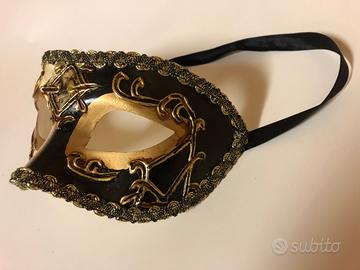 Maschera veneziana vintage bianca e nera con decorazione dorata a rilievo, adatta sia per essere indossata che per essere esposta a parete (dove è stata quasi sempre finora).