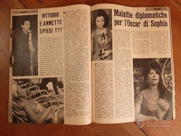 In vendita “Mascotte Raccolta” supplemento al n. 21 del quindicinale “Mascotte Spettacolo” del 20.11.1962, nato come rivista di spettacolo principalmente con foto di belle attricette in cerca di successo. Contiene i numeri 9 del 15.5.1962 – 10 del 31.5.1962 e 11 del 15.6.1962. Servizi fotografici alle principali e più note attrici e soubrette presenti nei numeri: MINA, Catherine Spaak, Natalie Wood, Ornella Vanoni, Sophia Loren, Antonella Lualdi. Jean Seberg, Gina Lollobrigida, Janet Leigh, Elke Sommer, Gemelle Kessler, Jayne Mansfield, Sandra Milo, Giorgia Moll. Moltissime le immagini ed i servizi di attrici note in quegli anni ma poi facilmente dimenticate dal grande pubblico. Condizioni di conservazione: molto buone con mancanze di piccolo angolo superiore sinistro copertina. Confrontare corredo fotografico che fa fede ai fini della offerta. Spedizione piego di libri raccomandata.