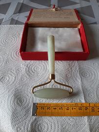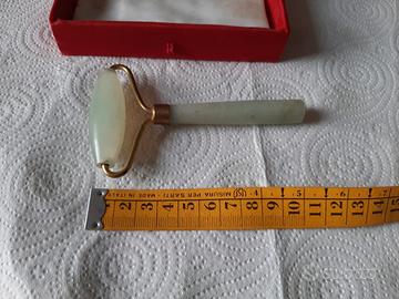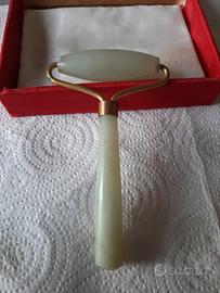 Massaggiatore per il viso in giada naturale, con rullo e manico puntatore. Un antico accessorio cinese per la cura della pelle.