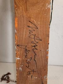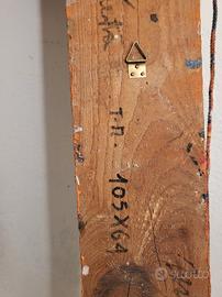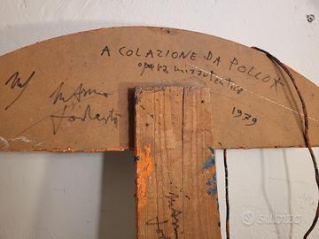 Opera polimaterica di Massimo Podestà intitolata "Colazione da Pollock" (1979) è un esempio emblematico del periodo concettuale e post-moderno dell'artista, caratterizzato dal recupero ironico delle avanguardie storiche. Tecnica: "Polimaterica" L'opera non si limita alla pittura, ma utilizza un assemblaggio di materiali diversi. Questo approccio è tipico della ricerca di Podestà sulla pittura d'oggetto, dove l'elemento tridimensionale o il materiale di recupero dialoga con la superficie cromatica. Significato del Titolo: Il titolo è un gioco di parole colto che unisce il riferimento cinematografico/letterario (Colazione da Tiffany) all'icona dell'Espressionismo Astratto, Jackson Pollock. L'artista trasforma il "sacro" gesto del dripping in un oggetto di consumo quotidiano o in una citazione domestica (la "colazione"). Contesto Artistico: Nel 1979, Podestà gravitava attorno alla Galleria Schema di Firenze e ai movimenti della Poesia Visiva. In questo lavoro, il segno "alla Pollock" viene decontestualizzato e reso quasi un reperto, perdendo la sua carica emotiva originale per acquisire una nuova valenza intellettuale e ludica. Tecnica: mista, vernice spray, pittura acrilica. Periodo: 1979 Espressionismo astratto. Dimensioni: 100x64