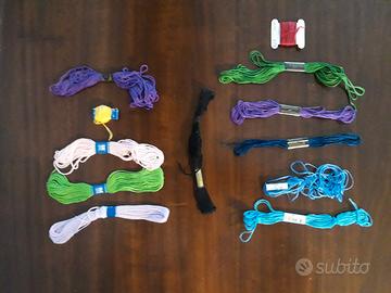90 matassine assortite di filo per punto croce di varie marche. Metà sono nuove, metà non più complete. Nel dettaglio in foto marche, numeri e condizioni.