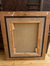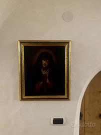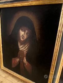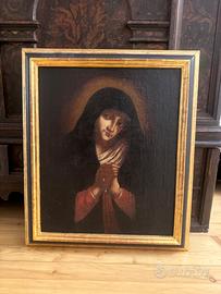 Mater Dolorosa – scuola di ambito barocco, olio su tela rintelata. Elegante dipinto devozionale raffigurante la Mater Dolorosa, eseguito secondo modelli della tradizione barocca. L’opera si distingue per la dolcezza espressiva del volto e per la resa luminosa dell’incarnato, con una composizione equilibrata e di forte impatto devozionale. Olio su tela, rintelato in epoca successiva a fini conservativi. Superficie con patina antica e craquelure coerente con l’età; presenti lievi segni del tempo e minime usure, che non compromettono la leggibilità complessiva. Cornice dorata ben proporzionata e decorativa. Dimensioni: circa 55 cm (con cornice). Opera di ambito devozionale, riconducibile a produzione tra XVIII e XIX secolo, ideale per collezionisti di arte sacra o per ambientazioni d’epoca.