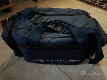 Borsone volo Pooleys, cosciale, libri AFE, Manuale PA-28, Plotter e altro.