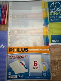 Vendo materiale scolastico composto da: 4 quadernoni Cartacento. Marca Blasetti. Righe con margine 3 tasche trasparenti con intercalari 6 tasti formato A4. Marca Polus 2 blocchi ricambi rinforzati 100 gr righe con margine 1 blocco ricambi rinforzati 70 gr righe con margine 1 blocco carta trasparente fogli 21x29,7. Marca Architetto 3 raccoglitori ad anelli grande. Marca Colorosa 14 pennarelli Stabilo Power 17 pennarelli Stabilo Pen 63