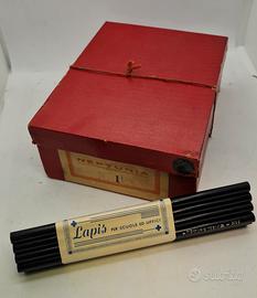 Produzione fine anni 40 primi anni 50. Legno e grafite in buone condizioni. Euro 20 ogni 12 matite fascettate -'Lapis' per scuole e uffici- . Su alcune matite la stampigliatura del marchio è leggermente sbiadita. Le scatole da 12 dozzine ( 1 grossa) sono ancora sigillate con il sigillo originale. Per l'acquisto della scatola intera, posso applicare uno sconto equivalente ad una dozzina in omaggio. Ho altri oggetti d'epoca tipo calamai in bachelite, opaline, cristallo, legno. Bottiglie d'inchiostro. Cannucce con pennini. Tamponi per inchiostro. Bilancine. Quaderni. E tanto altro, scrivetemi per ogni informazione.