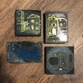 Matrici per stampa artistica con soggetti architettonici e urbani. Blocchi intagliati, realizzati in materiali come legno o a volte lastre di zinco, venivano inchiostrati e pressati su carta per creare stampe. Diverse tecniche e stili, da dettagli architettonici a rappresentazioni più astratte di paesaggi urbani. Oggetti considerati da collezione per il loro valore artistico e storico come strumenti di stampa tradizionali. L'inchiostro residuo blu e giallo sulle superfici mostra il loro uso nel processo di stampa. Le dimensioni sono circa 10 cm. X 10 cm. e 13 cm. X 8 cm.