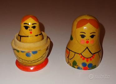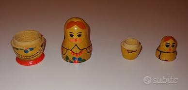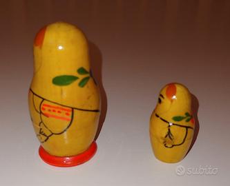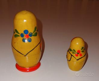 2 pezzi che si inseriscono uno dentro l'altro per formare la matrioska. Fine anni 80. Altezza matrioska più grande = 6,5 cm