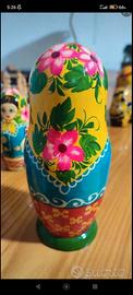 Matrioska originale ucraina composta da 5 pezzi in legno realizzati artigianalmente e riccamente decorati a mano su tutti i lati. La bambola più grande misura 19cm. Da collezione.