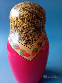 Matrioska vintage originale dell'ex Unione Sovietica (URSS). Pezzo unico, probabilmente la bambola "madre" di un set più numeroso. Misura 19 cm di altezza, una base di 7,5 cm e una larghezza corporea di circa 10 cm. Caratterizzata da colori vivaci e motivi floreali che decorano il corpo della bambola e il disegno geometrico a spirale del copricapo, si può collocare la sua produzione nel periodo sovietico, tra gli anni '70 e i primi anni '80. La matrioska, il cui nome deriva dal latino mater ("madre") simboleggia la fertilità, la maternità, la cura e la continuità della vita. Dipinta a mano su legno. Nonostante l'età, si presenta in ottime condizioni vintage, può avere lievi segni dati dal tempo e dalla conservazione. Può funzionare anche come portaoggetti o scatola da arredamento e decorativa.