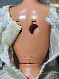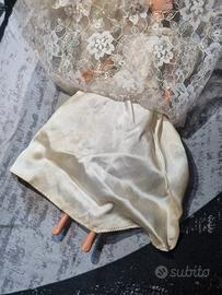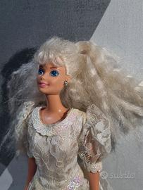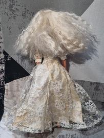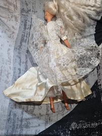 Barbie sposa Mattel con marchio 1966, con lunghi capelli biondi e occhi azzurri. Indossa un elegante abito da sposa in pizzo color avorio con dettagli floreali e leggere finiture iridescenti. L’abito presenta maniche a sbuffo in pizzo trasparente, corpetto lavorato e
