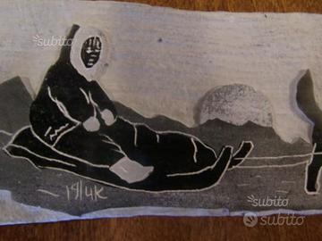Opera irregolare su pietra lavica a bassorilievo, made in Canada by IGLUK. Con filo per appendere. Per chi non la conosce questa pietra nella parte posteriore è come il marmo color verde con tutte le sue striature. Originale Canada come da bollino.Misure cm 26 x cm 6,5 . Difficile da trovare a questo prezzo !!